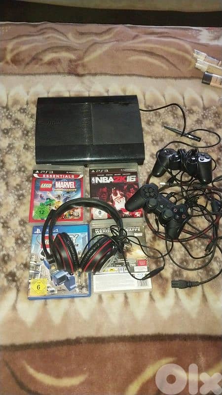 بلاي ستيشن 3 من المانيا الاصليه، مع اثنين جهاز تحكم، ومع العاب فيديو جميله، وجميع الاكسسوارات التي تحتاج اليها بلاي ستيشن، ومع سماعه ومايك وللالعاب الاون لاين.