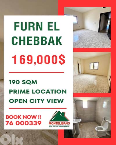 Prime Location 190 sqm Apartment For Sale in Furn El Chebbak (فرن الشباك) with Open City View Fourth Floor 3 Bedrooms 3 Bathrooms 1 Parking Balcony Salon Dining Room Living Room Kitchen Elevator Good Condition Price: 169,000$ Cash Payment MONTELIBANO S. A. L. are Dedicated to Delivering Superior real estate services in Lebanon, while Ensuring optimum satisfaction of its clients. Our team of experts will be pleased to serve you Contact us to schedule a site visit, or reply with your contact details and our sales team will contact you very soon. Montelibano S. A. L. Jdeideh. Lebanon