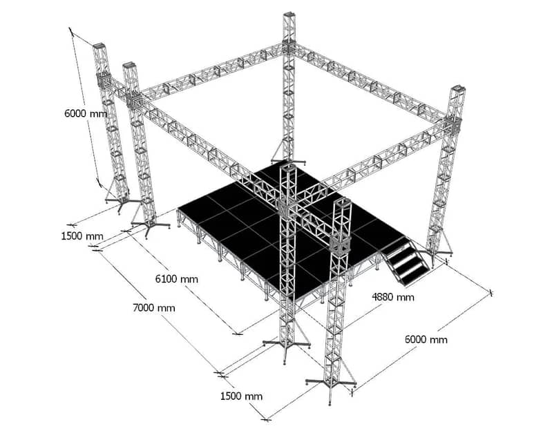 This professional stage and truss structure system is designed for concerts, weddings, festivals, and large events. It includes a strong stage platform with an aluminum truss frame above, ideal for mounting lighting, speakers, LED screens, and effects.