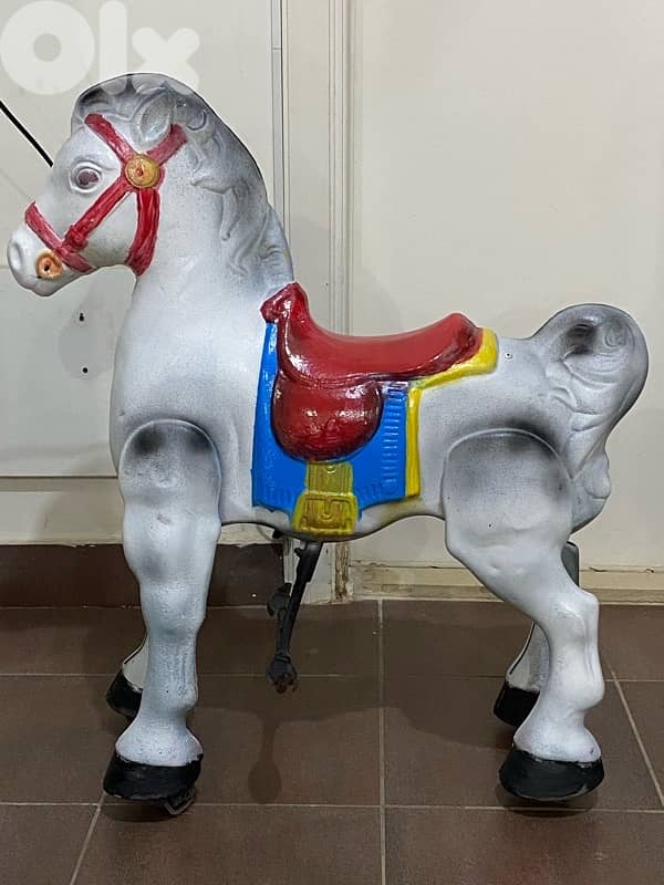 rare early century Mobo horse toy for kids made of steel and articulated parts to move and pedals with stamped on them. perfect condition and colors considering Ahe over 80 years old. rare piece to collect
