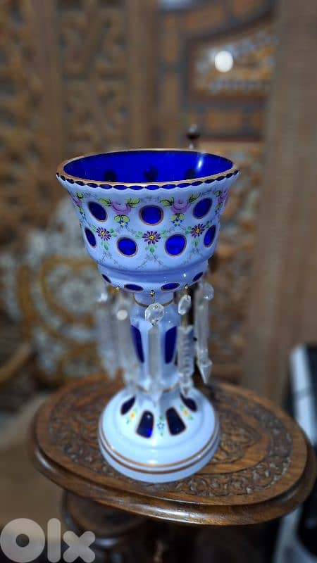 An exquisite 19th-century Bohemian Cased Glass Mantel Luster, a true masterpiece of Victorian-era craftsmanship. This rare find features a regal cobalt blue core encased in hand-carved opaque milk glass, meticulously cut-to-clear to reveal luminous ‘jewel’ windows. Adorned with delicate hand-painted enamel floral sprays and shimmering 24K gold gilt accents, it stands complete with a full suite of hand-cut lead crystal prisms that catch and dance with the light. A breathtaking statement of old-world opulence, this heirloom-quality piece is the pinnacle of European glass artistry—a must-have for the discerning collector of fine antiques.