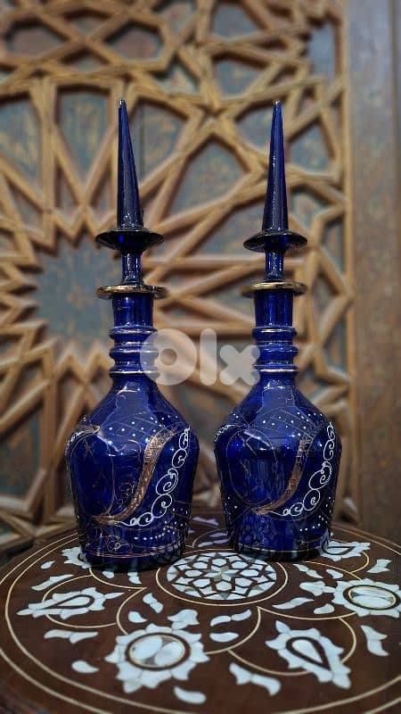 Offered from a private collection, this exquisite pair of hand-blown "Bristol Blue" glass gulabpash represents the pinnacle of old-world Orientalist luxury. Each vessel is a masterpiece of craftsmanship, featuring deep cobalt hues adorned with intricate, hand-applied 24-karat gold filigree and delicate raised enamel scrollwork. Historically used in royal courts to mist guests with sacred rosewater, these statuesque sprinklers—with their iconic spiked finials and ringed necks—are no longer mere bottles, but timeless artifacts of hospitality. A rare opportunity for the serious collector to acquire a matching set of such vivid pigment and preserved gilding. These are the crown jewels of any vanity or curios cabinet.