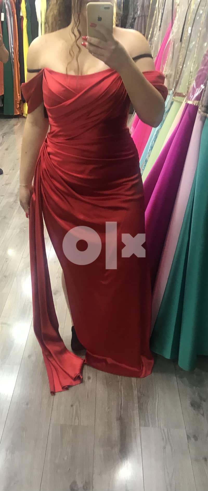 Brand : Seref vural - istanbul Size : 46 Red color Trendy santin classy dress off shoulders dress with a slit on the side Only worn once