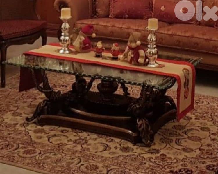 صالون للبيع مولف من مقعد كبير و أثنين منفرد و طاولة بالوسط خشب طوب زجاج و طاولة عدد ٢ طوب رخام