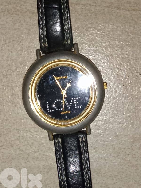 Shivas quartz wristwatch, which features a black dial with a diamond-studded "LOVE" text design and a black leather strap