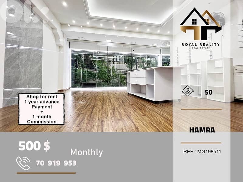 Consider this 50 sqm shop for rent in a prime location in hamra. This 50 sqm shop consist of: * 50 sqm open showroom More features: * Prime location * Fully decorated * Lightning * Outside shop bathroom * Great investment * Catchy price Price 500$ + 1 year in advance + 1 month commission Contact us at 70 919 953 Ref: Mg1985011