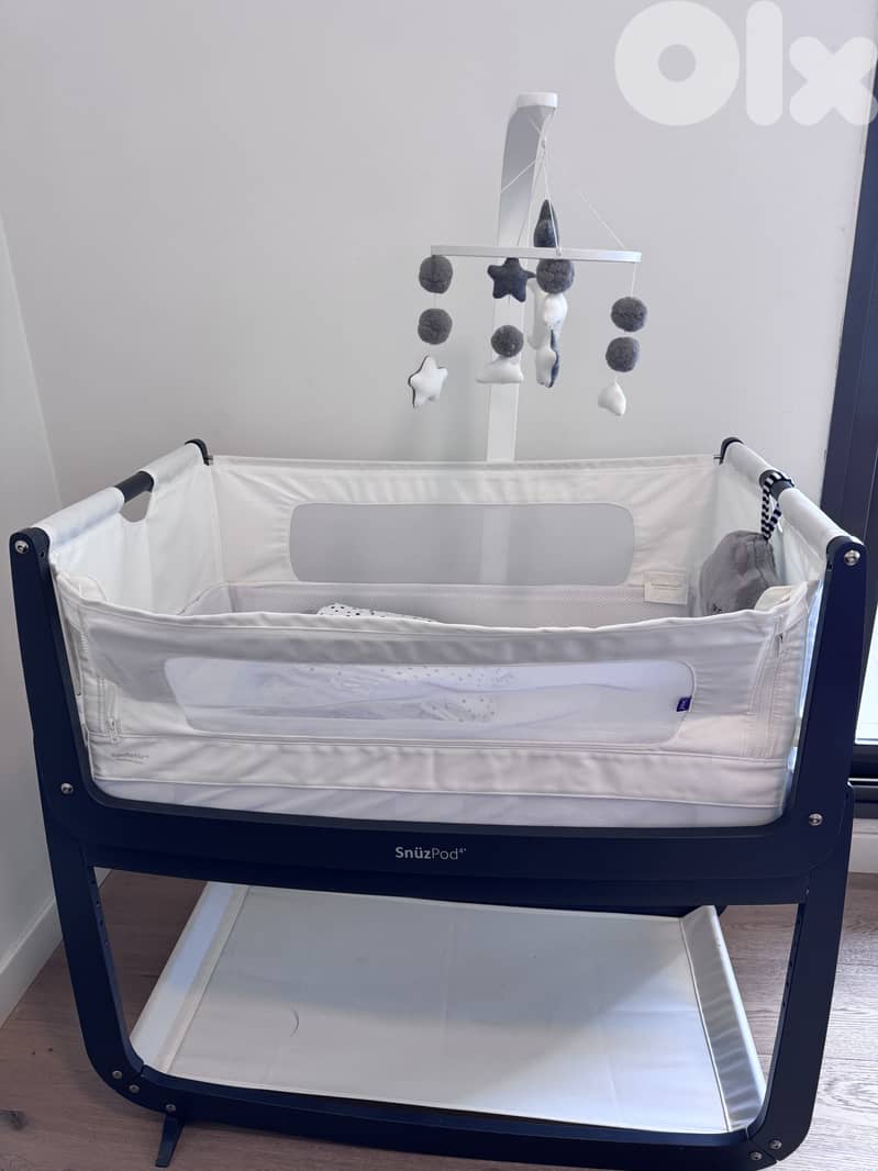 Snuz pod 4 - next to me - slate dark grey including: mattress, 4 fitted sheets, mobile white stars, cloud sleeping aid grey hanging musical toy All in excellent condition