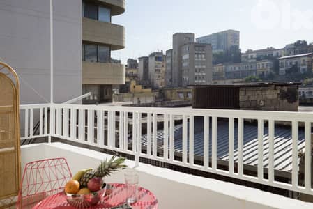 Beyond the glass doors, the balcony catches the soft hum of the street below. A small table and two chairs wait for fresh croissants in the morning or a late-night conversation under Beirut’s warm sky.