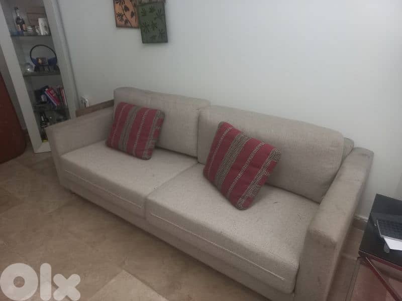 three seater sofa, beige color with two cushions. used but still in good condition and is very comfortable needs a bit of cleaning only