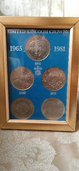 UK Crown Coins set of Memorial Coins 1965 to 1981 Queen Elizabeth II ,WW II Prime Minister Churchil , Prince Charles ,Princess Daiana. Very special collection Frame Portrait. . To see more press on " Mohamad"