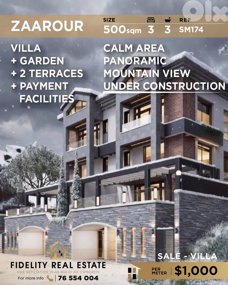 فيلا قيد الإنشاء بمساحة ٥٠٠ متر مربع للبيع في زعرور (إطلالة بانورامية على الجبل - منطقة هادئة) SM174