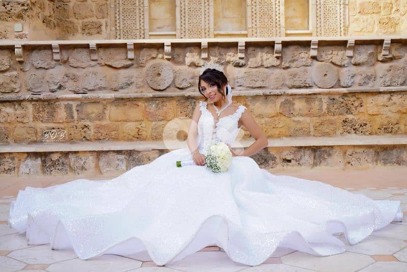 a once worn wedding dress for sale in a very good condition with 2 veils (long and short) and the crown