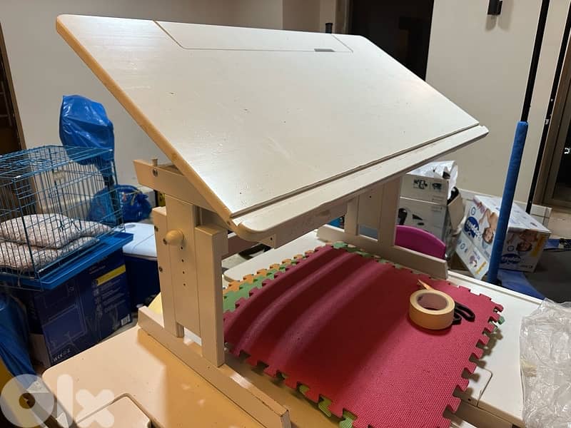 White adjustable wooden table for studying, working or drawing. Tilts up and has one drawer. Works for children and adults.