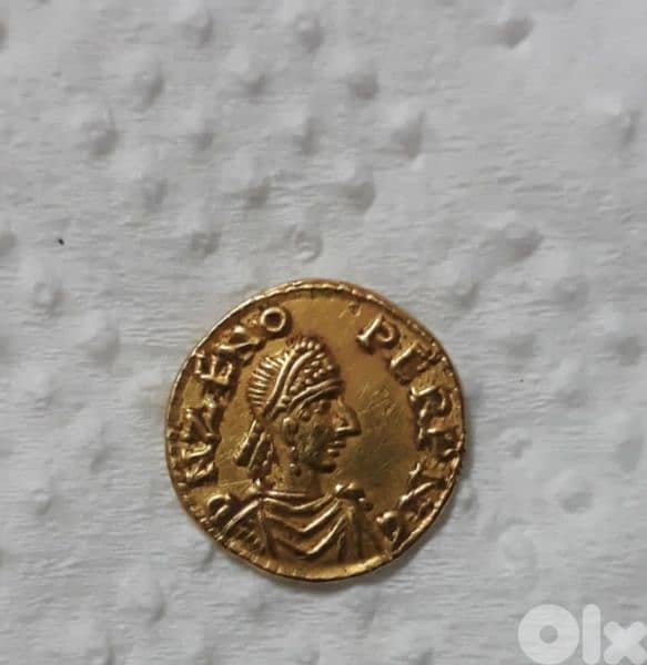 Zeno Emperor Eastern Roman Gold Coin Tremissis, First reign, A. D. 474-475. AV (1.36 gms), Ravenna Mint. NGC AU, Strike: 5/5 Surface: 2/5. Clipped, Flan Flaw, Graffito.